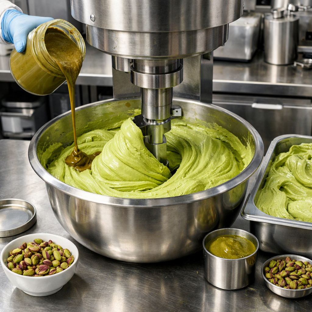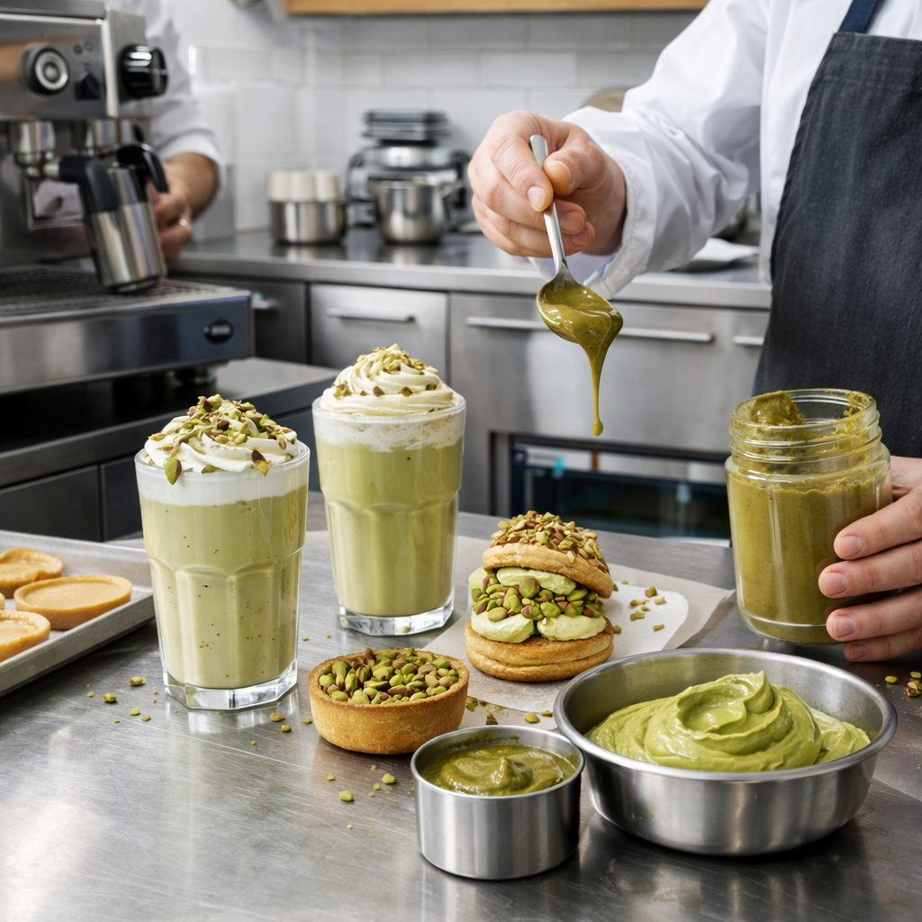 Our pistachio paste and cream are developed for professional use — smooth blending, stable structure and predictable performance in large-volume production.