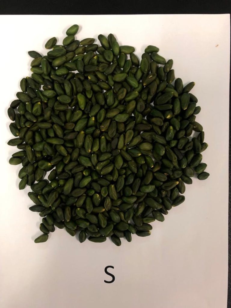 Generally the peeled pistachio kernels are only assorted according to their color. pistachio kernels are the greenest when small and unripe.